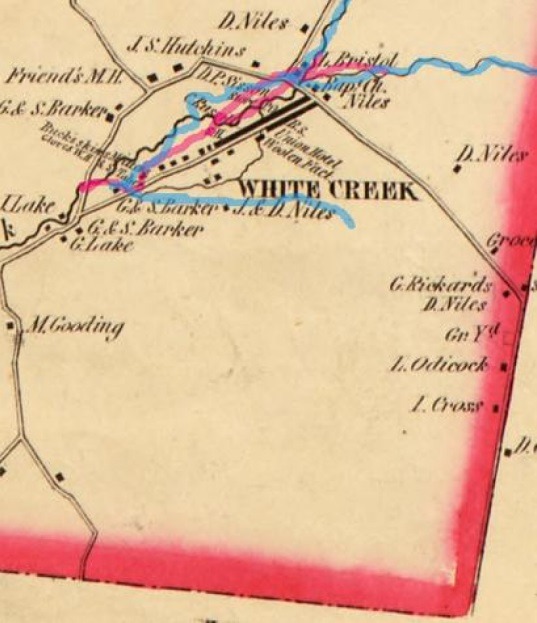 By 1853, the mill was identified as a woolen factory, marking its transition from traditional grain milling to textile production. The rerouting of water suggests that Akin’s system involved diverting a portion of White Creek’s flow through an artificial channel, optimizing it for industrial use.
